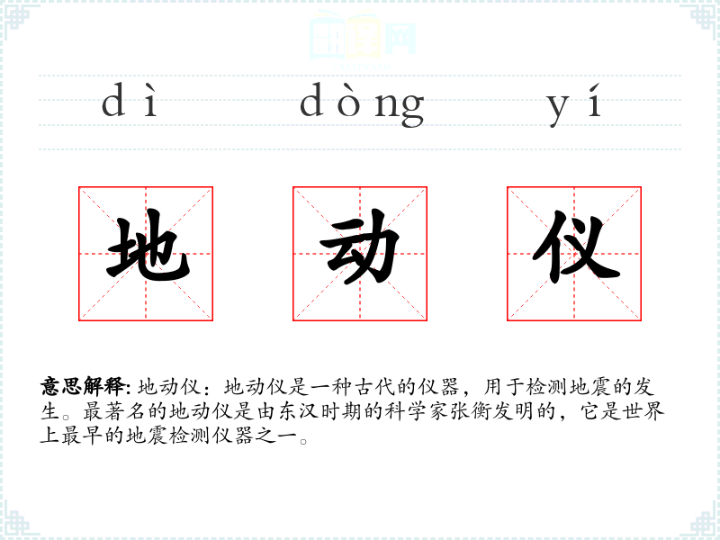 - 词源:地动仪这个词由“地动”(地震)和“仪”(仪器)组成,直接反映了其功能。