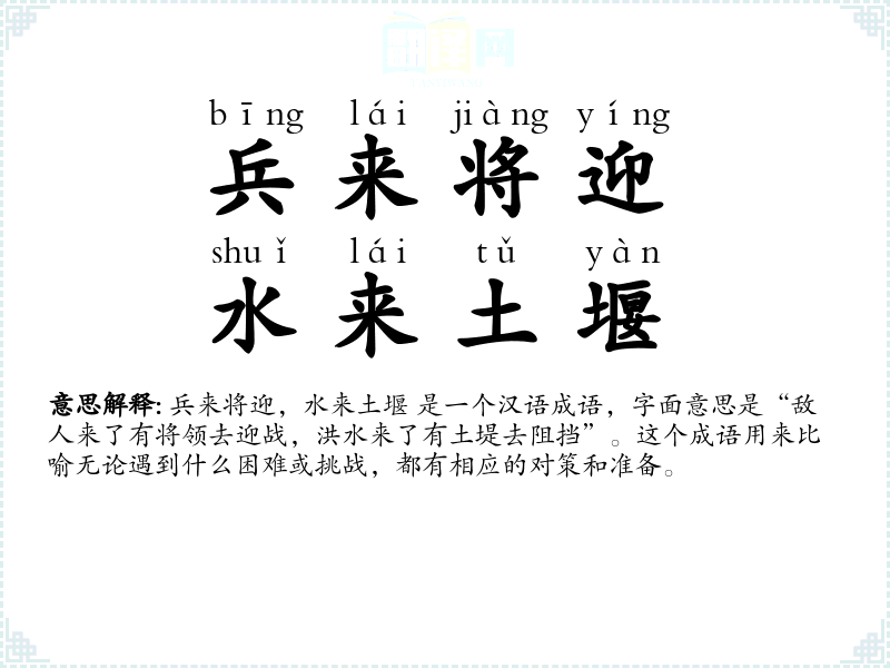 - bīng lái jiàng yíng,shuǐ lái tǔ yàn兵来将迎,水来土堰