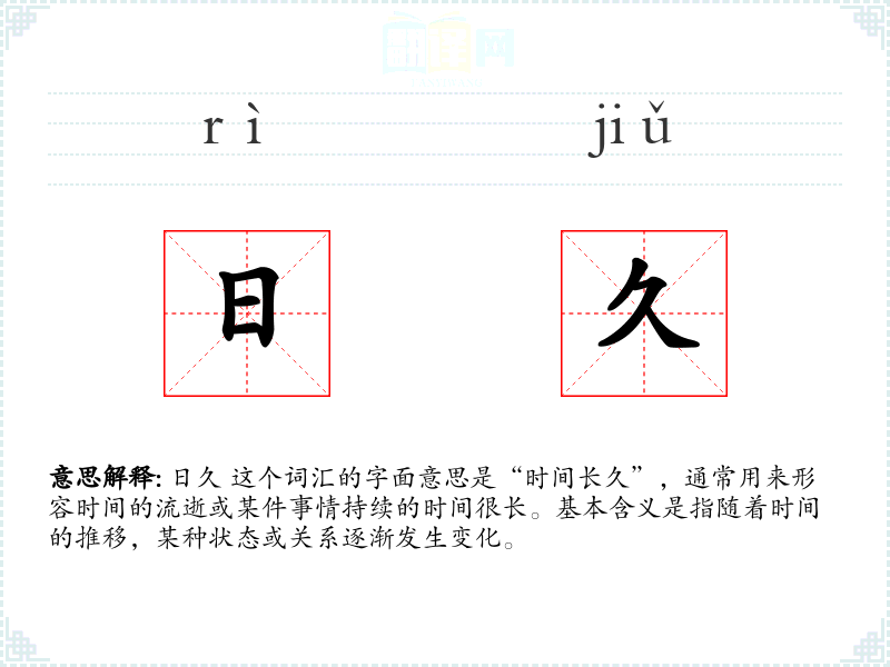 “日久”这个词汇源自汉语,由“日”(太阳,代表时间)和“久”(长久)组成。在古代汉语中,“日久”就已经被用来形容时间的流逝。随着语言的发展,这个词汇的用法和含义基本保持稳定。