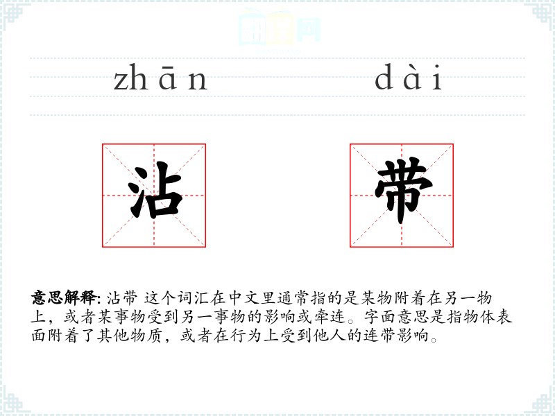 沾带 这个词汇在中文里通常指的是某物附着在另一物上,或者某事物受到另一事物的影响或牵连。字面意思是指物体表面附着了其他物质,或者在行为上受到他人的连带影响。