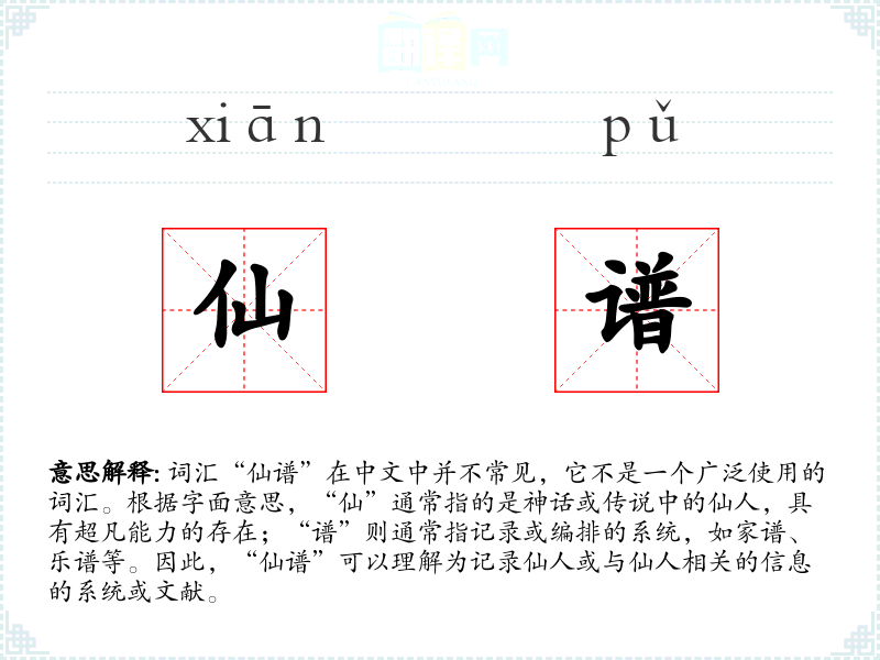 - 反义词:(由于“仙谱”较为特殊,反义词不明显,可以考虑“凡谱”这样的创造性反义词)
