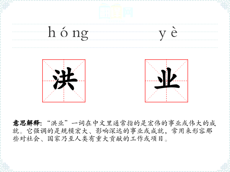 “洪业”一词在中文里通常指的是宏伟的事业或伟大的成就。它强调的是规模宏大、影响深远的事业或成就,常用来形容那些对社会、国家乃至人类有重大贡献的工作或项目。