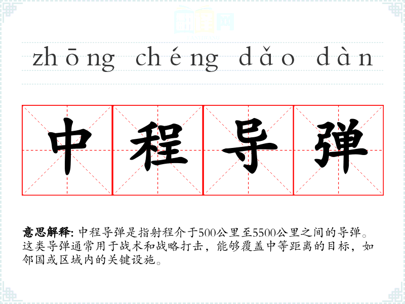 - 专业领域:在军事和国际关系领域,中程导弹是一个专业术语,用于描述特定类型的武器系统及其战略意义。