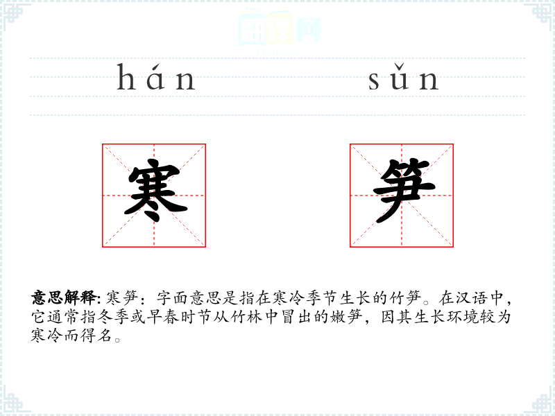 寒笋:字面意思是指在寒冷季节生长的竹笋。在汉语中,它通常指冬季或早春时节从竹林中冒出的嫩笋,因其生长环境较为寒冷而得名。