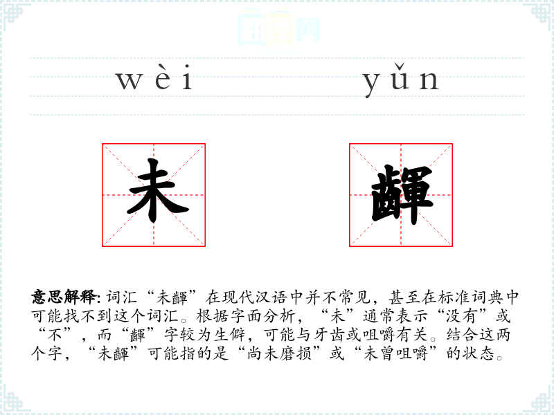 词汇“未齳”在现代汉语中并不常见,甚至在标准词典中可能找不到这个词汇。根据字面分析,“未”通常表示“没有”或“不”,而“齳”字较为生僻,可能与牙齿或咀嚼有关。结合这两个字,“未齳”可能指的是“尚未磨损”或“未曾咀嚼”的状态。