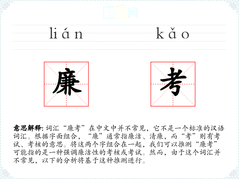 词汇“廉考”在中文中并不常见,它不是一个标准的汉语词汇。根据字面组合,“廉”通常指廉洁、清廉,而“考”则有考试、考核的意思。将这两个字组合在一起,我们可以推测“廉考”可能指的是一种强调廉洁性的考核或考试。然而,由于这个词汇并不常见,以下的分析将基于这种推测进行。