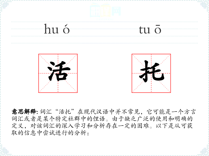词汇“活托”在现代汉语中并不常见,它可能是一个方言词汇或者是某个特定社群中的俚语。由于缺乏广泛的使用和明确的定义,对该词汇的深入学习和分析存在一定的困难。以下是从可获取的信息中尝试进行的分析: