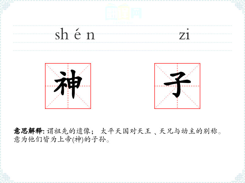 谓祖先的遗像; 太平天国对天王﹑天兄与幼主的别称。意为他们皆为上帝(神)的子孙。