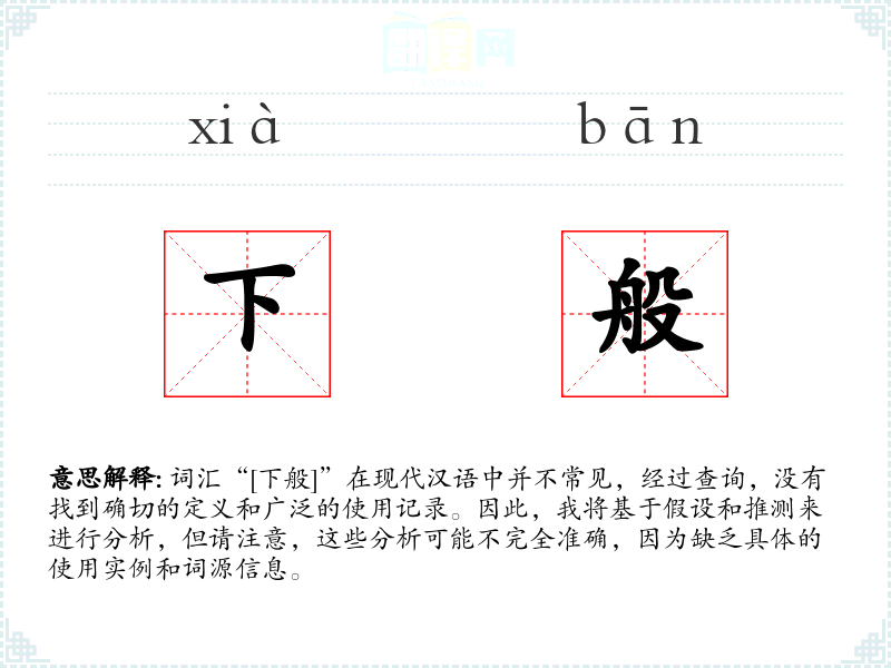 词汇“[下般]”在现代汉语中并不常见,经过查询,没有找到确切的定义和广泛的使用记录。因此,我将基于假设和推测来进行分析,但请注意,这些分析可能不完全准确,因为缺乏具体的使用实例和词源信息。