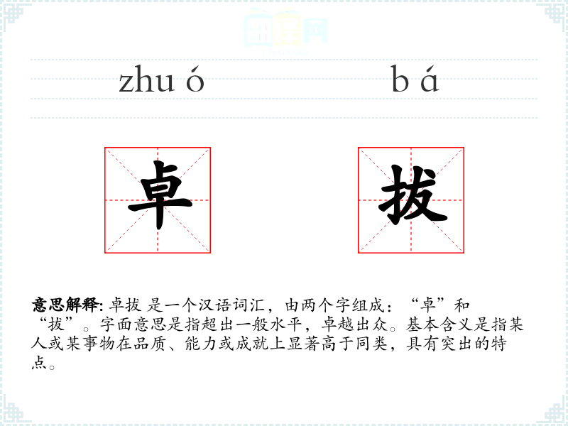 卓拔 是一个汉语词汇,由两个字组成:“卓”和“拔”。字面意思是指超出一般水平,卓越出众。基本含义是指某人或某事物在品质、能力或成就上显著高于同类,具有突出的特点。