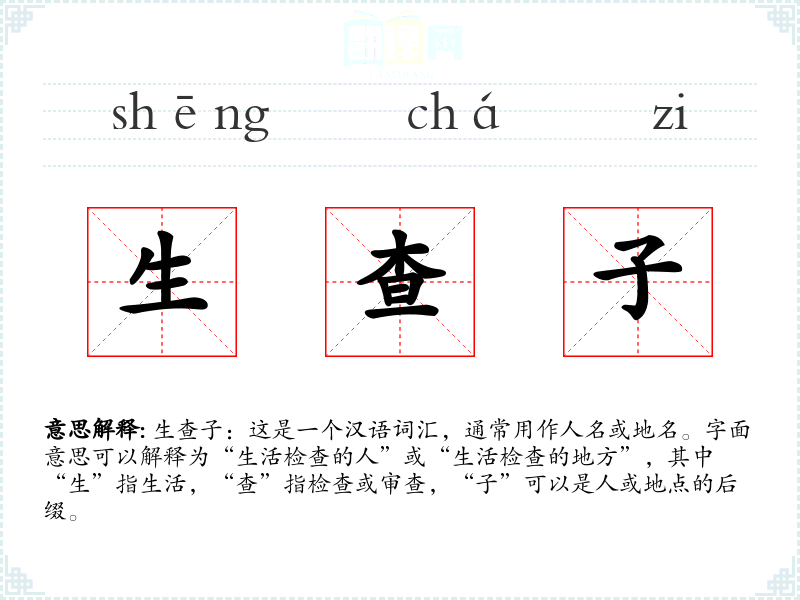 生查子:这是一个汉语词汇,通常用作人名或地名。字面意思可以解释为“生活检查的人”或“生活检查的地方”,其中“生”指生活,“查”指检查或审查,“子”可以是人或地点的后缀。