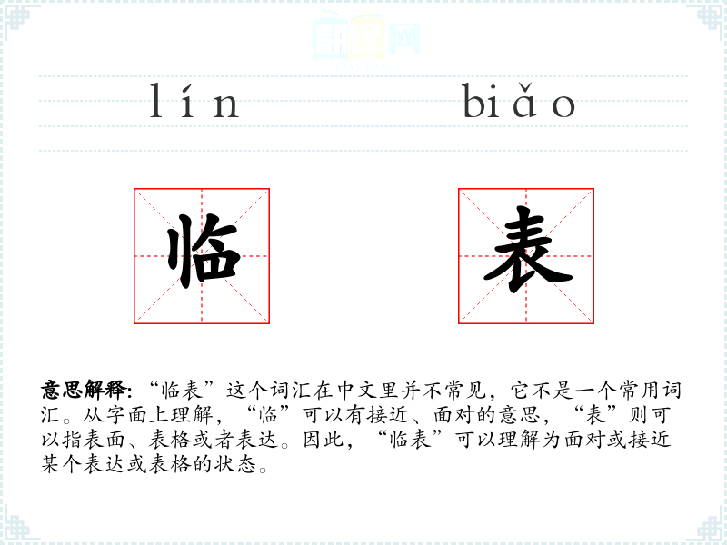 “临表”这个词汇在中文里并不常见,它不是一个常用词汇。从字面上理解,“临”可以有接近、面对的意思,“表”则可以指表面、表格或者表达。因此,“临表”可以理解为面对或接近某个表达或表格的状态。