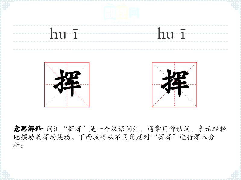 词汇“挥挥”是一个汉语词汇,通常用作动词,表示轻轻地摆动或挥动某物。下面我将从不同角度对“挥挥”进行深入分析: