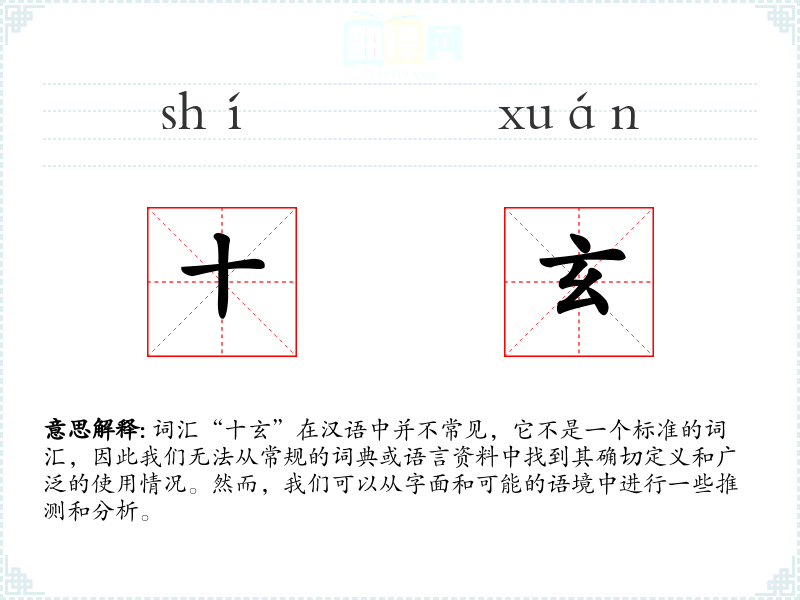 词汇“十玄”在汉语中并不常见,它不是一个标准的词汇,因此我们无法从常规的词典或语言资料中找到其确切定义和广泛的使用情况。然而,我们可以从字面和可能的语境中进行一些推测和分析。