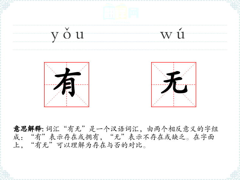 词汇“有无”是一个汉语词汇,由两个相反意义的字组成:“有”表示存在或拥有,“无”表示不存在或缺乏。在字面上,“有无”可以理解为存在与否的对比。