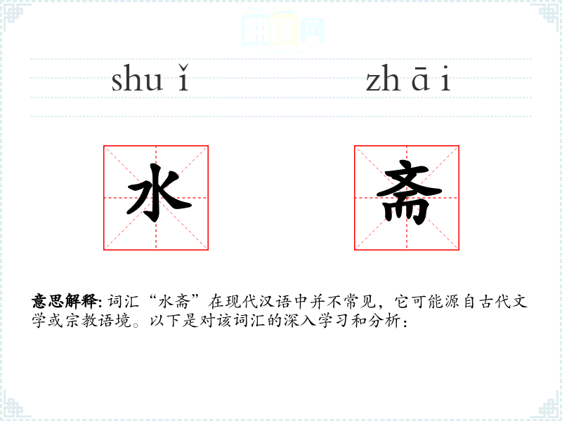 词汇“水斋”在现代汉语中并不常见,它可能源自古代文学或*语境。以下是对该词汇的深入学和分析: