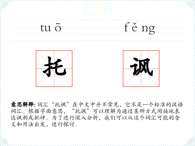 词汇“托讽”在中文中并不常见,它不是一个标准的汉语词汇。根据字面意思,“托讽”可以理解为通过某种方式间接地表达讽刺或批评。为了进行深入分析,我们可以从这个词汇可能的含义和用法出发,进行探讨。