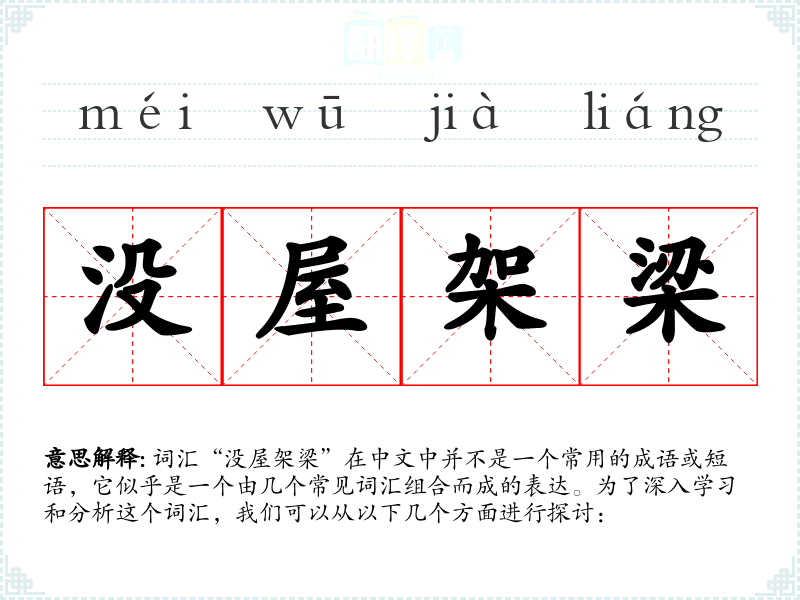 词汇“没屋架梁”在中文中并不是一个常用的成语或短语,它似乎是一个由几个常见词汇组合而成的表达。为了深入学*和分析这个词汇,我们可以从以下几个方面进行探讨: