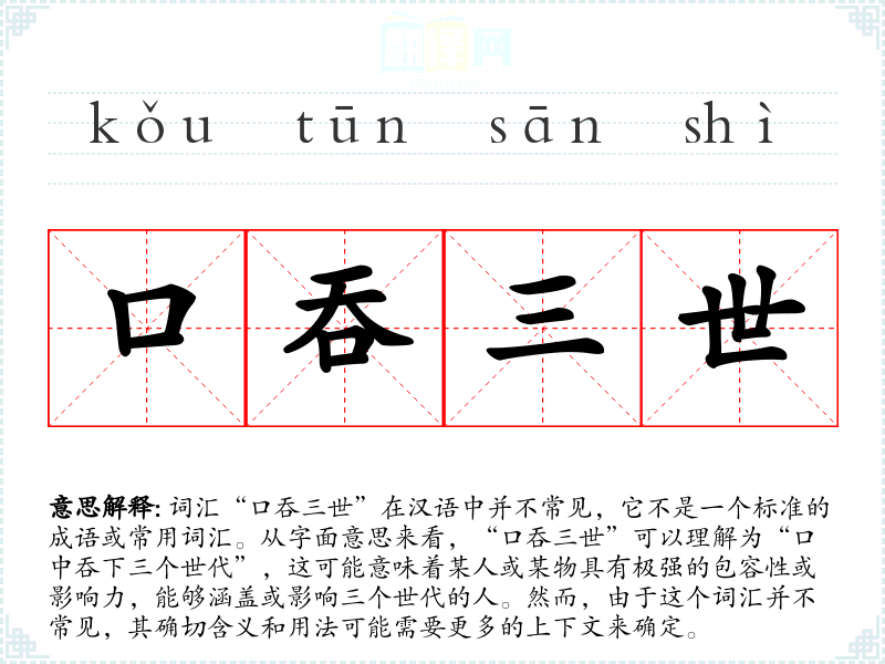 词汇“口吞三世”在汉语中并不常见,它不是一个标准的成语或常用词汇。从字面意思来看,“口吞三世”可以理解为“口中吞下三个世代”,这可能意味着某人或某物具有极强的包容性或影响力,能够涵盖或影响三个世代的人。然而,由于这个词汇并不常见,其确切含义和用法可能需要更多的上下文来确定。