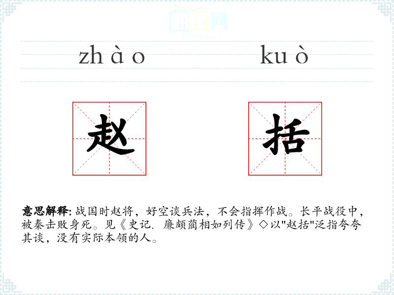 战国时赵将,好空谈兵法,不会指挥作战。长平战役中,被秦击败身死。见《史记.廉颇蔺相如列传》◇以"赵括"泛指