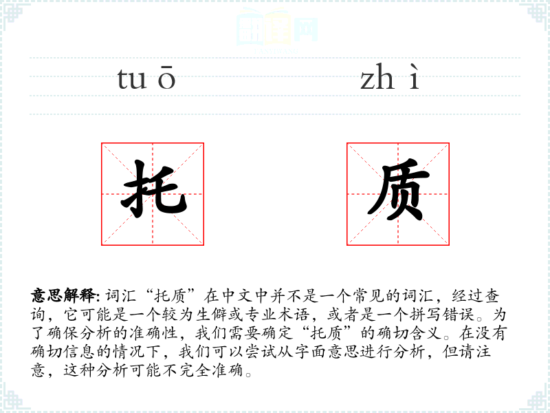 词汇“托质”在中文中并不是一个常见的词汇,经过查询,它可能是一个较为生僻或专业术语,或者是一个拼写错误。为了确保分析的准确性,我们需要确定“托质”的确切含义。在没有确切信息的情况下,我们可以尝试从字面意思进行分析,但请注意,这种分析可能不完全准确。