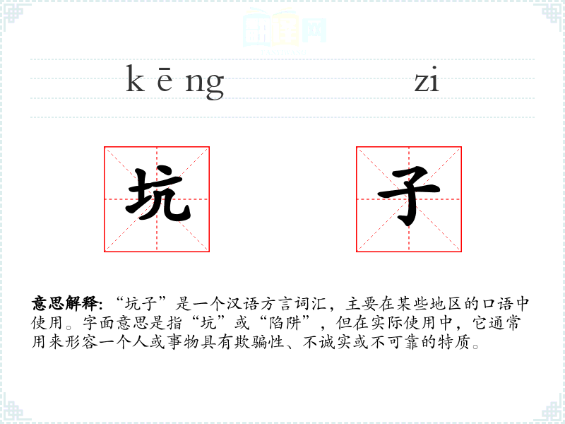 “坑子”是一个汉语方言词汇,主要在某些地区的口语中使用。字面意思是指“坑”或“陷阱”,但在实际使用中,它通常用来形容一个人或事物具有欺骗性、不诚实或不可靠的特质。