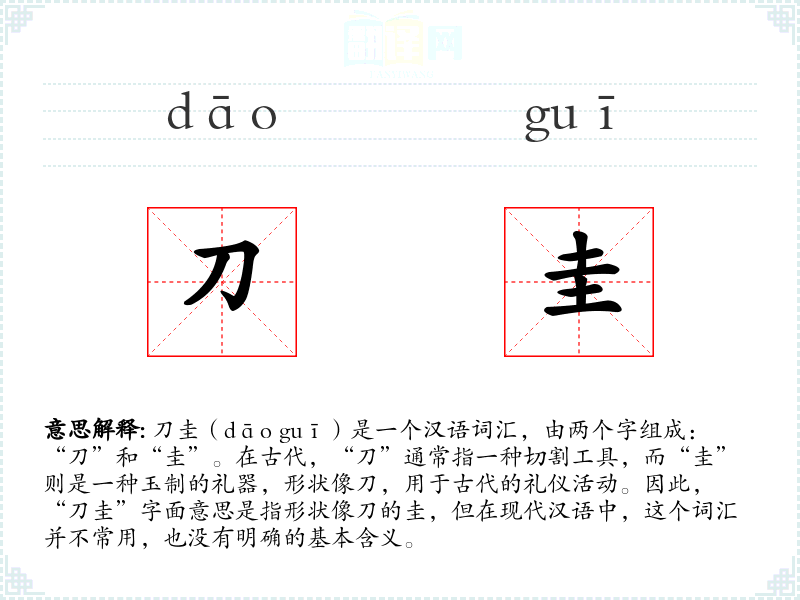 由于“刀圭”在现代汉语中不常用,很难找到直接的同义词或反义词。在古代,可能会有其他描述礼器的词汇,如“玉璋”、“玉琮”等,但它们与“刀圭”并不完全等同。