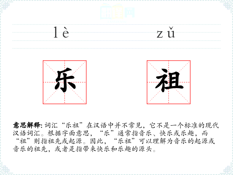 词汇“乐祖”在汉语中并不常见,它不是一个标准的现代汉语词汇。根据字面意思,“乐”通常指音乐、快乐或乐趣,而“祖”则指祖先或起源。因此,“乐祖”可以理解为音乐的起源或音乐的祖先,或者是指带来快乐和乐趣的源头。