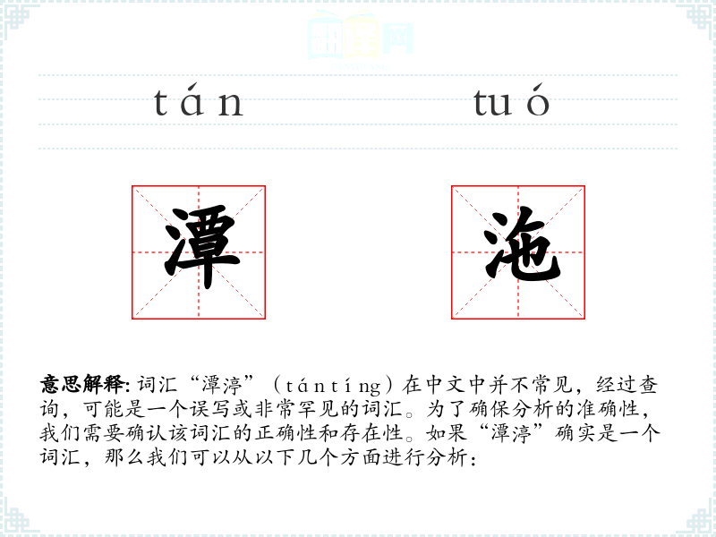 由于“潭渟”可能是一个误写或非常罕见的词汇,上述分析可能不完全准确。如果能够确认该词汇的正确性和存在性,我们可以进一步深入分析。