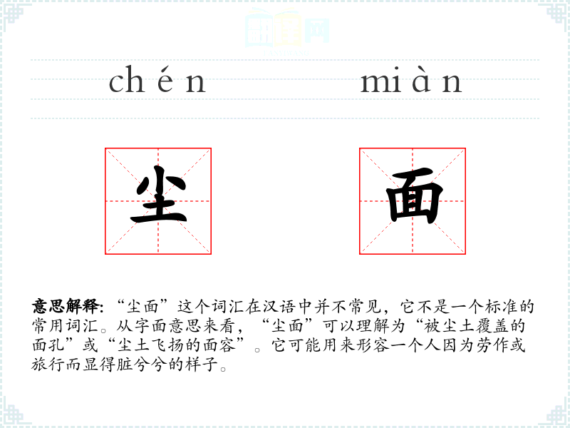 “尘面”这个词汇在汉语中并不常见,它不是一个标准的常用词汇。从字面意思来看,“尘面”可以理解为“被尘土覆盖的面孔”或“尘土飞扬的面容”。它可能用来形容一个人因为劳作或旅行而显得脏兮兮的样子。