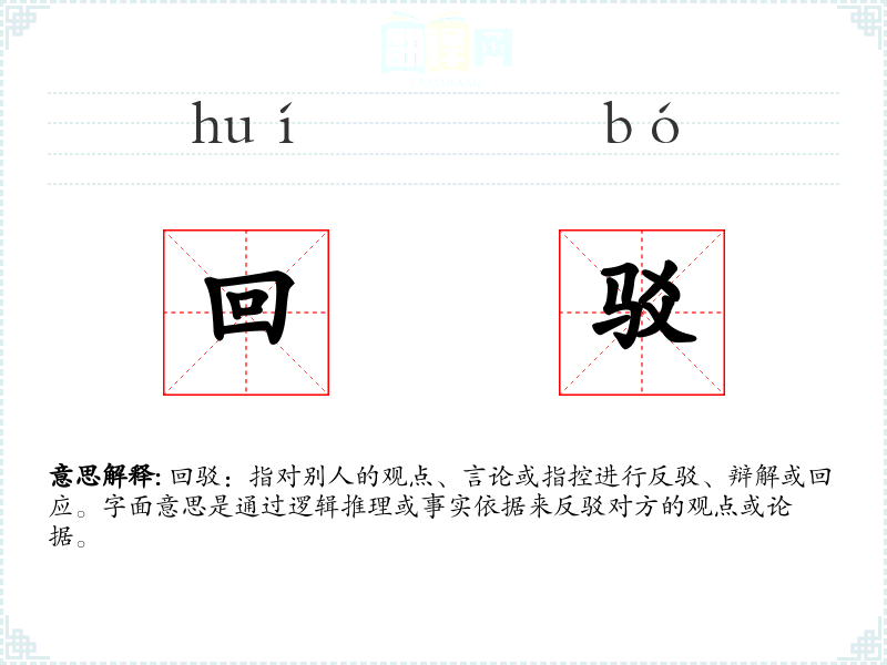 回驳:指对别人的观点、言论或指控进行反驳、辩解或回应。字面意思是通过逻辑推理或事实依据来反驳对方的观点或论据。