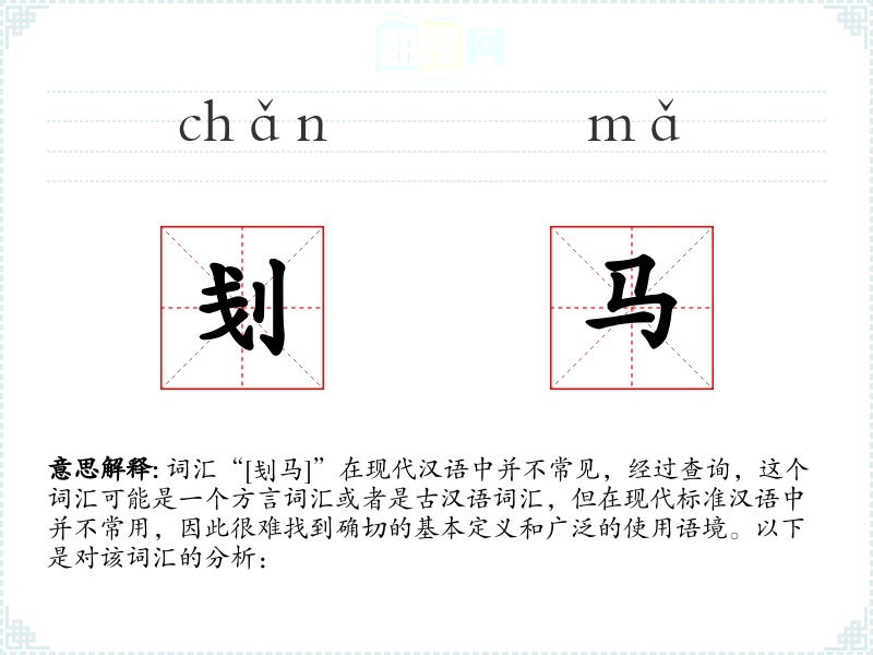 词汇“[刬马]”在现代汉语中并不常见,经过查询,这个词汇可能是一个方言词汇或者是古汉语词汇,但在现代标准汉语中并不常用,因此很难找到确切的基本定义和广泛的使用语境。以下是对该词汇的分析: