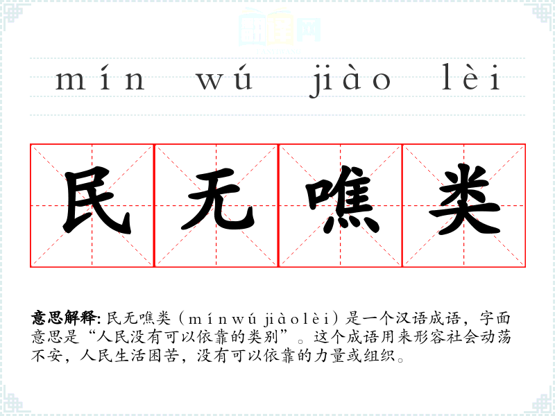 民无噍类(mín wú jiào lèi)是一个汉语成语,字面意思是“人民没有可以依靠的类别”。这个成语用来形容社会动荡不安,人民生活困苦,没有可以依靠的力量或组织。