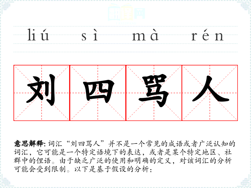 词汇“刘四骂人”并不是一个常见的成语或者广泛认知的词汇,它可能是一个特定语境下的表达,或者是某个特定地区、社群中的俚语。由于缺乏广泛的使用和明确的定义,对该词汇的分析可能会受到限制。以下是基于假设的分析: