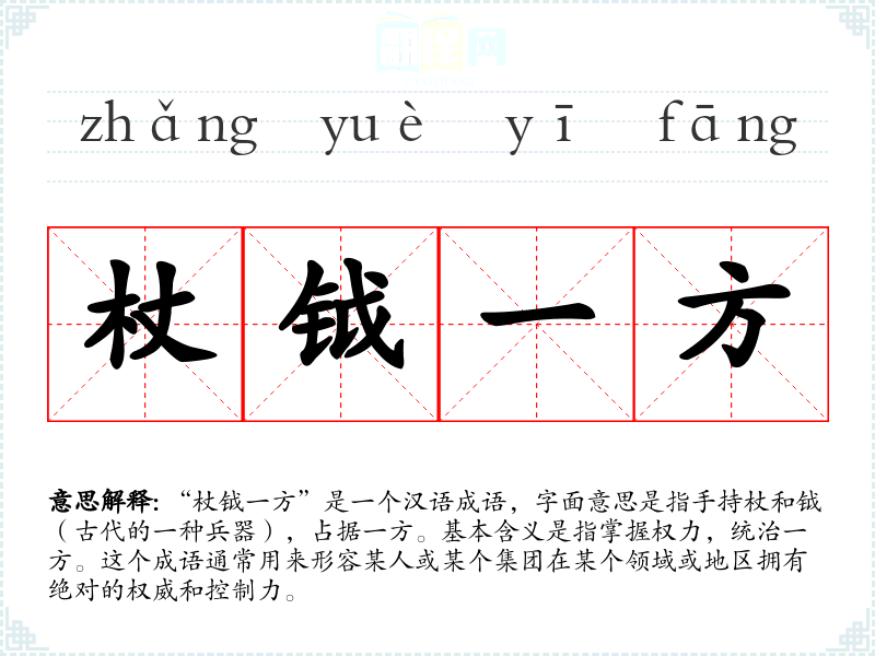 “杖钺一方”是一个汉语成语,字面意思是指手持杖和钺(古代的一种兵器),占据一方。基本含义是指掌握权力,统治一方。这个成语通常用来形容某人或某个集团在某个领域或地区拥有绝对的权威和控制力。