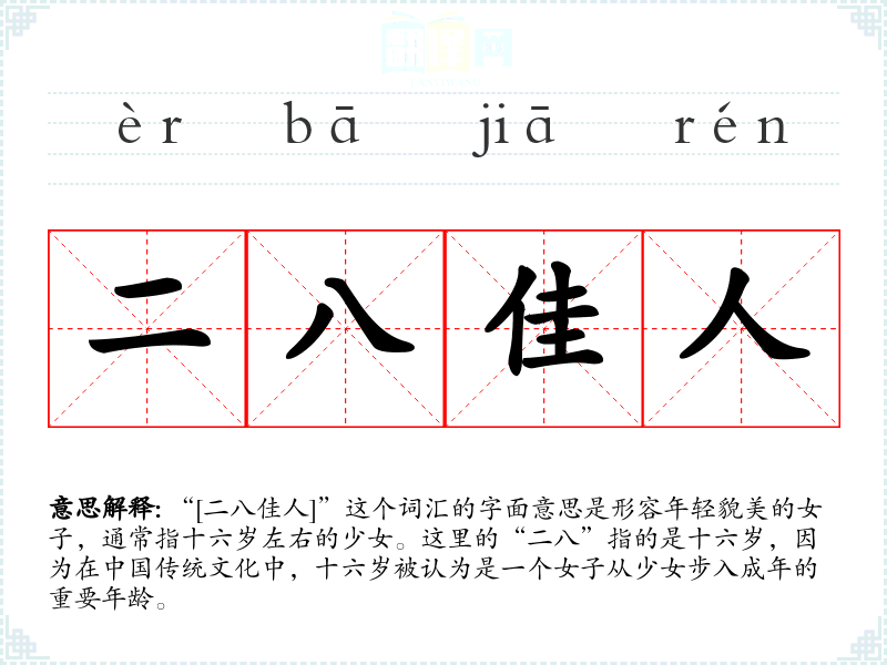 “[二八佳人]”这个词汇的字面意思是形容年轻貌美的女子,通常指十六岁左右的少女。这里的“二八”指的是十六岁,因为在**传统文化中,十六岁被认为是一个女子从少女步入成年的重要年龄。