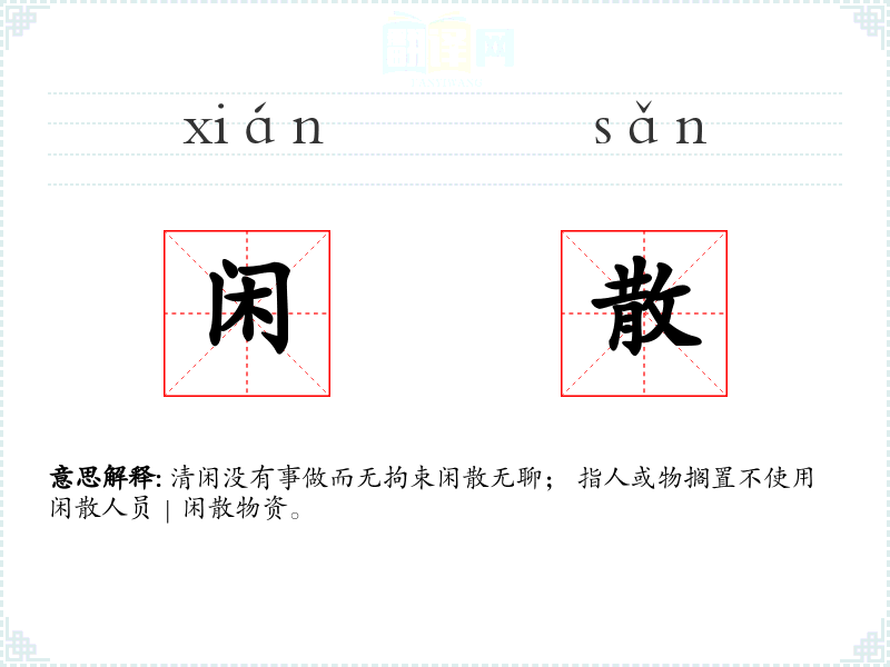 清闲没有事做而无拘束闲散无聊; 指人或物搁置不使用闲散人员|闲散物资。