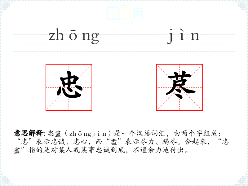 忠盡(zhōng jìn)是一个汉语词汇,由两个字组成:“忠”表示忠诚、忠心,而“盡”表示尽力、竭尽。合起来,“忠盡”指的是对某人或某事忠诚到底,不遗余力地付出。