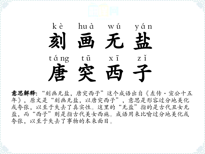 “刻画无盐,唐突西子”这个成语出自《左传·宣公十五年》,原文是“刻画无盐,以唐突西子”,意思是形容过分地美化或夸张,以至于失去了真实性。这里的“无盐”指的是古代丑女无盐,而“西子”则是指古代美女西施。成语用来比喻过分地美化或夸张,以至于失去了事物的本来面目。