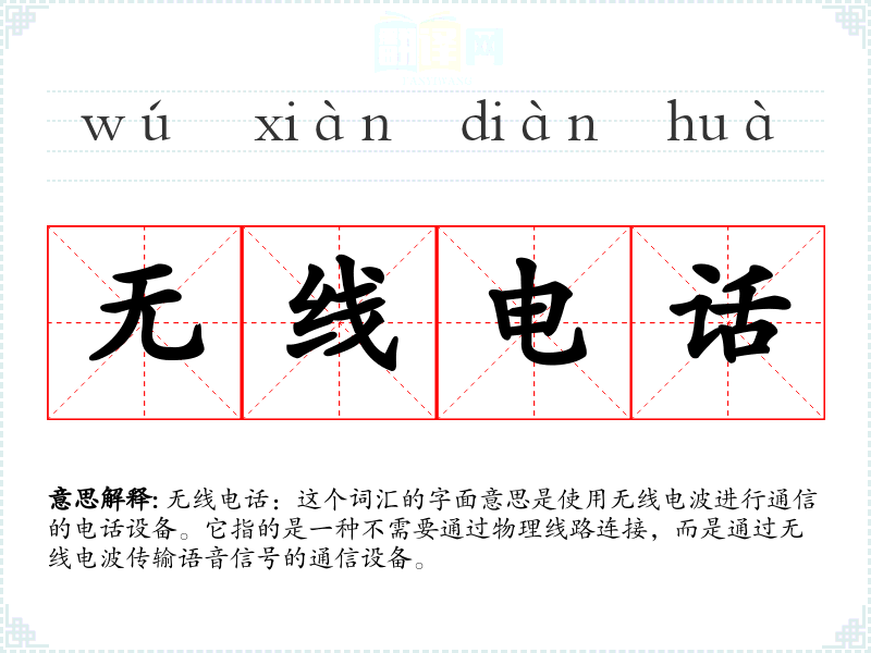 无线电话:这个词汇的字面意思是使用无线电波进行通信的电话设备。它指的是一种不需要通过物理线路连接,而是通过无线电波传输语音信号的通信设备。