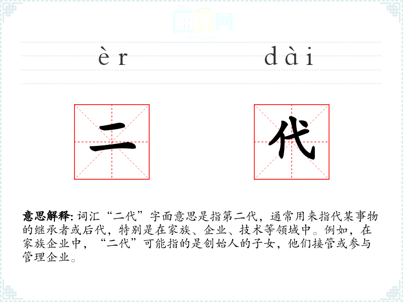 词汇“二代”字面意思是指第二代,通常用来指代某事物的继承者或后代,特别是在家族、企业、技术等领域中。例如,在家族企业中,“二代”可能指的是创始人的子女,他们接管或参与管理企业。