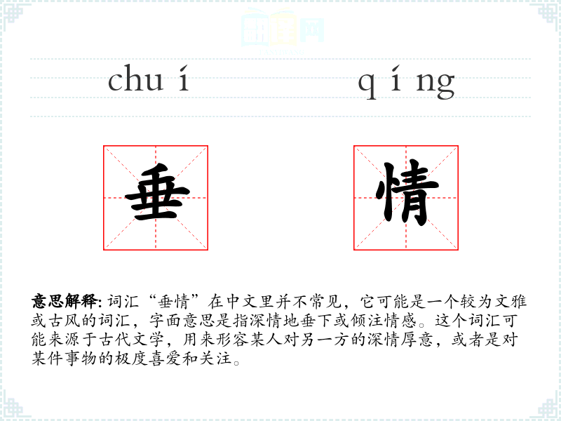 - 文学:在古代诗词或散文中,可能会用“垂情”来形容诗人对远方亲人或爱人的思念之情。