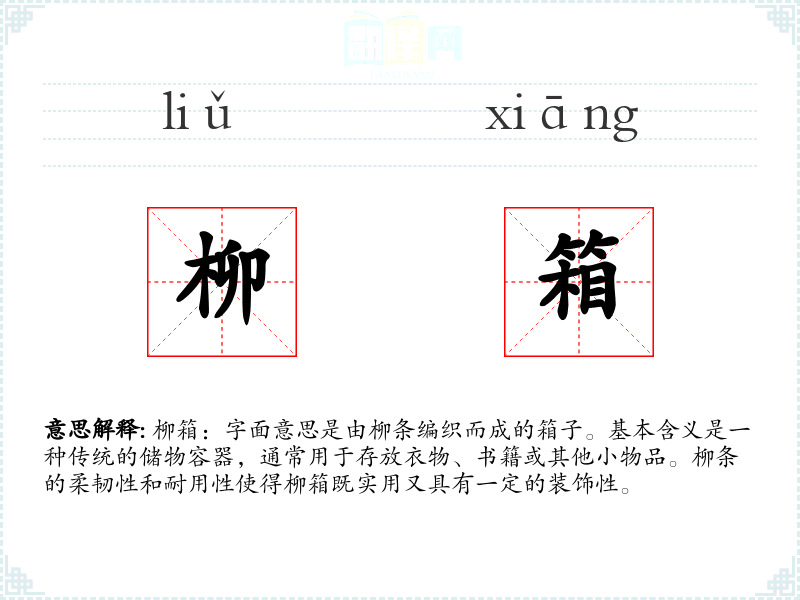 柳箱:字面意思是由柳条编织而成的箱子。基本含义是一种传统的储物容器,通常用于存放衣物、书籍或其他小物品。柳条的柔韧性和耐用性使得柳箱既实用又具有一定的装饰性。