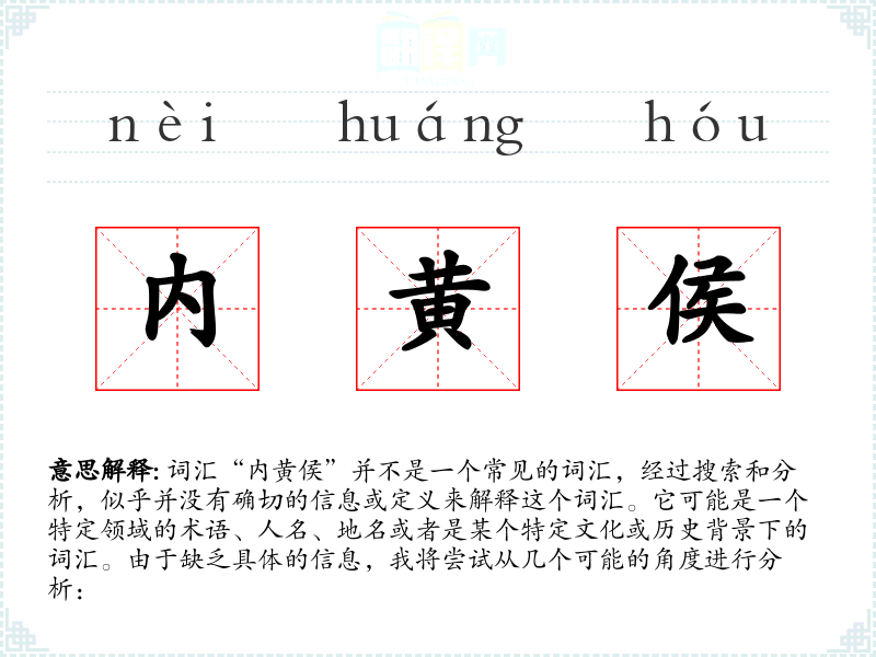 由于“内黄侯”不是一个广为人知的词汇,我们无法提供一个确切的基本定义。它可能是一个特定历史时期的称谓,或者是某个特定社群中的术语。