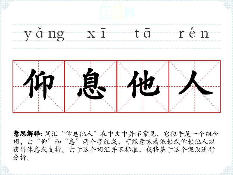 词汇“仰息他人”在中文中并不常见,它似乎是一个组合词,由“仰”和“息”两个字组成,可能意味着依赖或仰赖他人以获得休息或支持。由于这个词汇并不标准,我将基于这个假设进行分析。