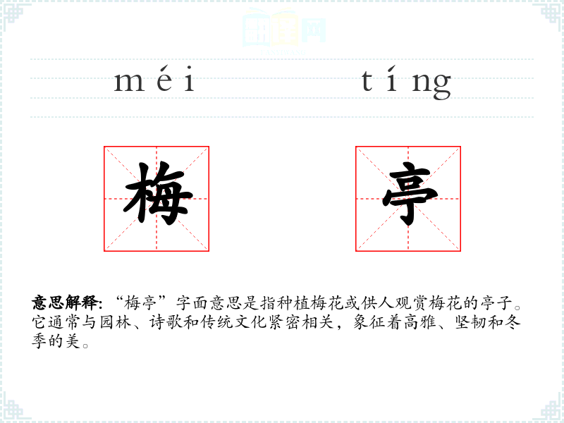 “梅亭”字面意思是指种植梅花或供人观赏梅花的亭子。它通常与园林、诗歌和传统文化紧密相关,象征着高雅、坚韧和冬季的美。