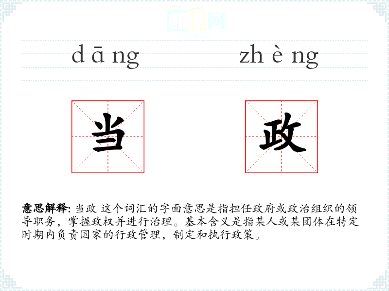 当政 这个词汇的字面意思是指担任政府或政治组织的领导职务,掌握政权并进行治理。基本含义是指某人或某团体在特定时期内负责国家的行政管理,制定和执行政策。