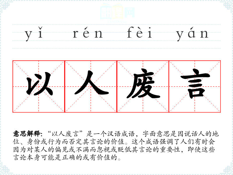 “以人废言”是一个汉语成语,字面意思是因说话人的地位、身份或行为而否定其言论的价值。这个成语强调了人们有时会因为对某人的偏见或不满而忽视或贬低其言论的重要性,即使这些言论本身可能是正确的或有价值的。