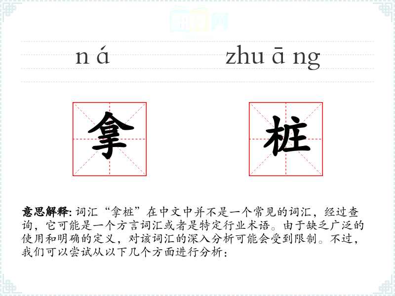 由于“拿桩”不是一个标准汉语词汇,我们无法给出一个确切的字面意思和基本含义。它可能是指某种特定的动作或行为,但具体含义需要结合具体语境来确定。