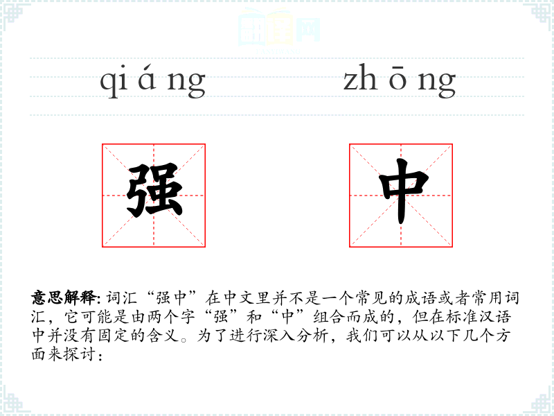 词汇“强中”在中文里并不是一个常见的成语或者常用词汇,它可能是由两个字“强”和“中”组合而成的,但在标准汉语中并没有固定的含义。为了进行深入分析,我们可以从以下几个方面来探讨: